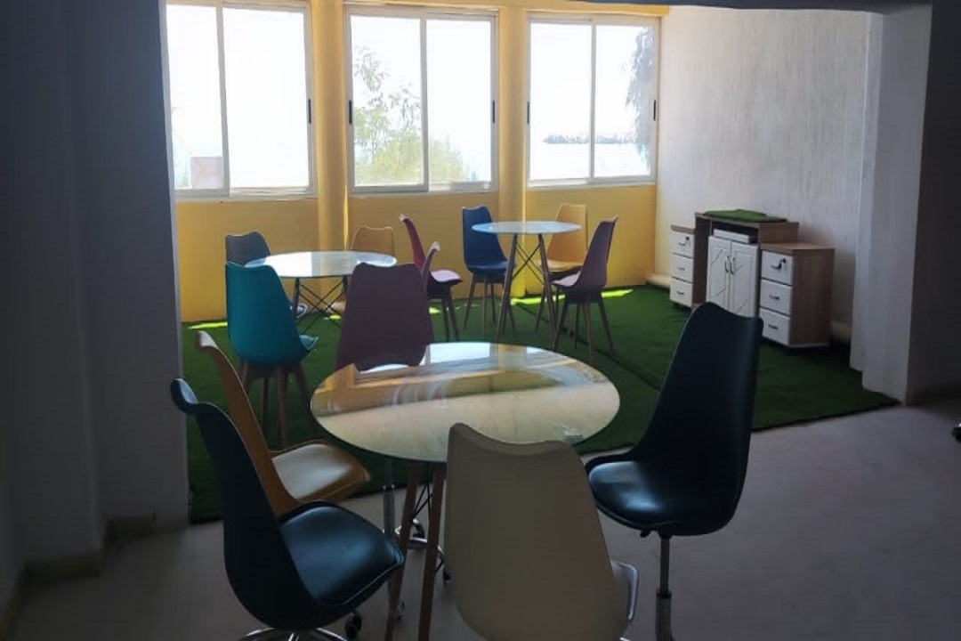 - A co-working space with high-speed internet (50 Mbps), printers, computers, individual desks, collaborative areas, and a relaxation zone.